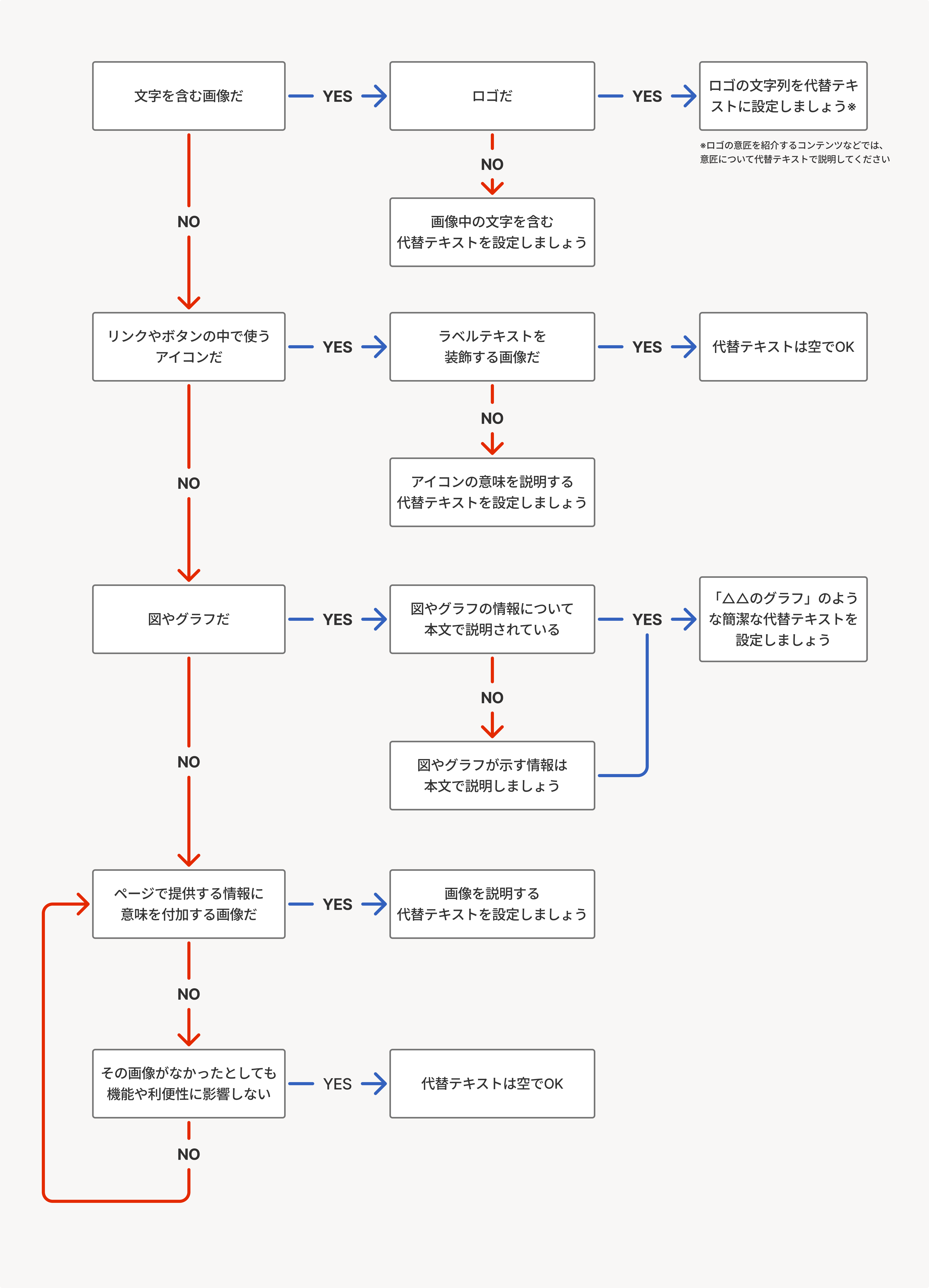 <br>などのHTML要素は使用できない - 画像に含まれる情報が多く、説明が長くなったり、複雑になってしまう場合は、要約した内容を代替テキストにするか、説明を本文に追加することを検討する