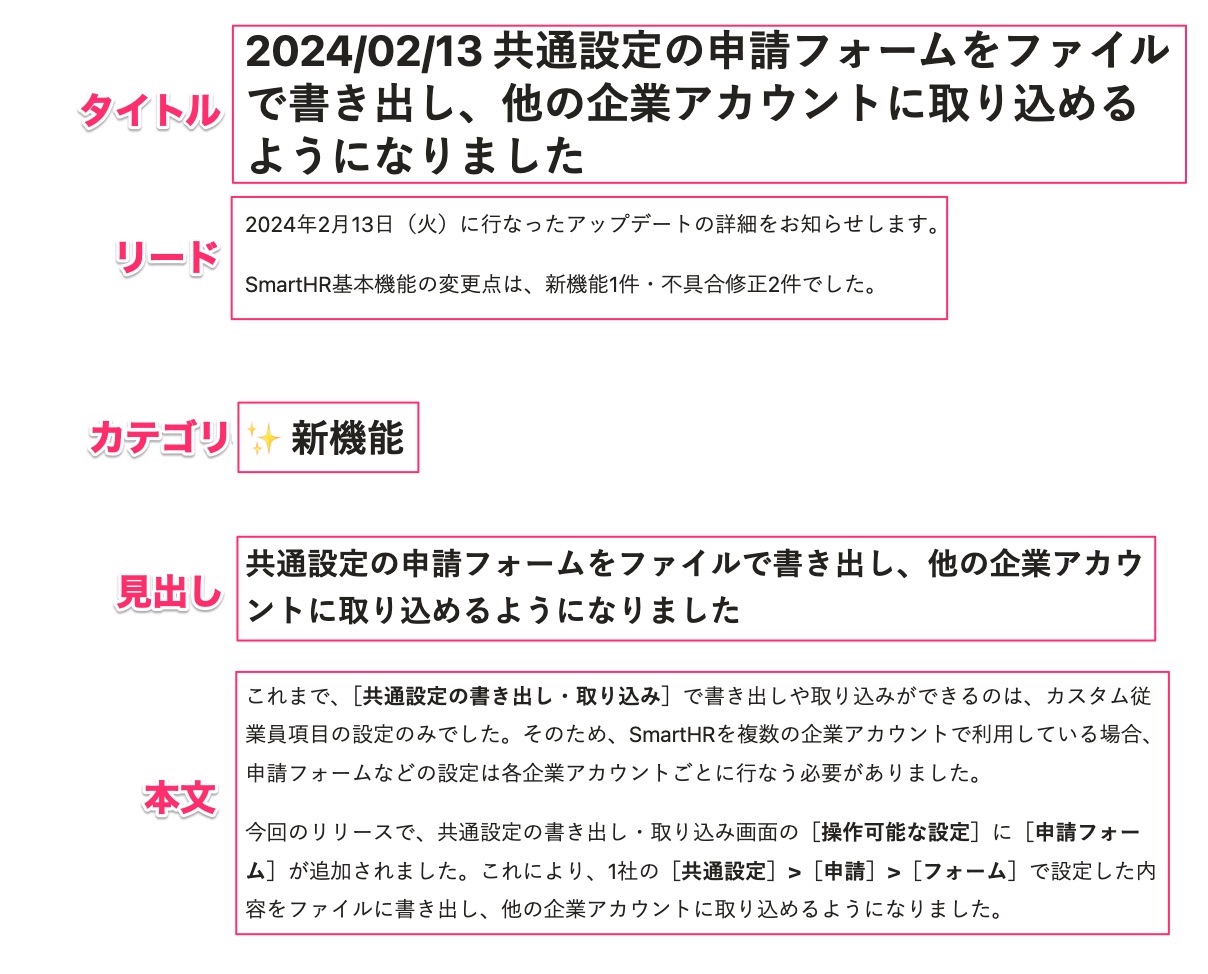 1つのカテゴリに複数のリリース内容が含まれる場合は、ユーザーへの影響が大きいものから順に記載します。