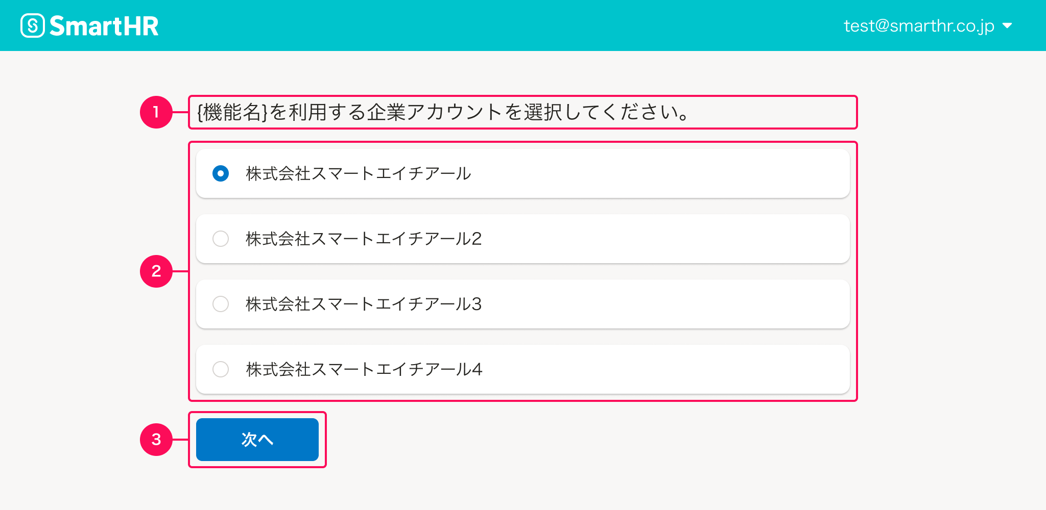 SmartHR基本機能からオプション機能に移動する際に、企業アカウントを選択する画面を定義します。