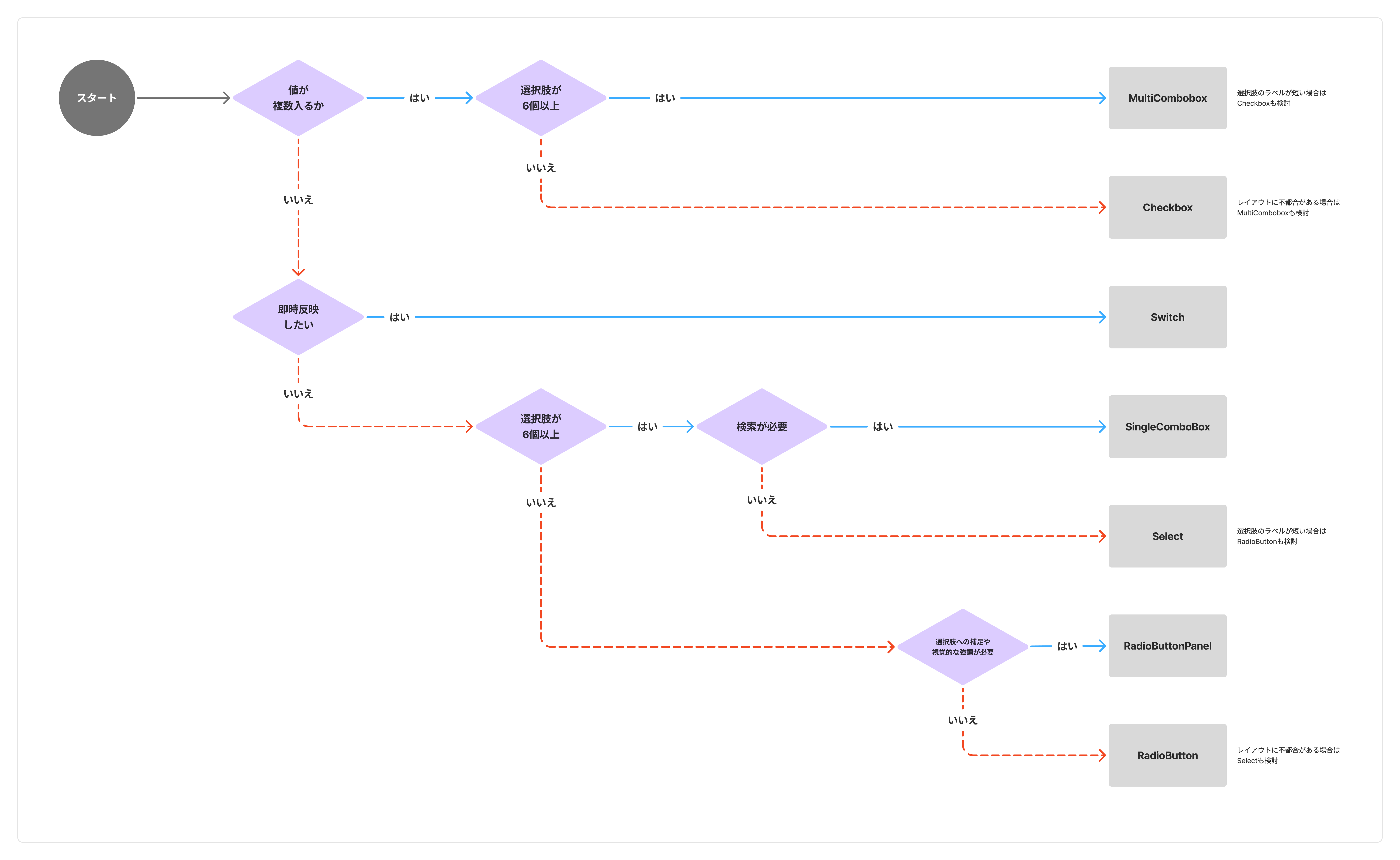 選択操作に関わるコンポーネント(MultiCombobox、SingleCombobox、Select、RadioButton、RadioButtonPanel、Checkbox、Switch)の使い分けの基準を定義します。